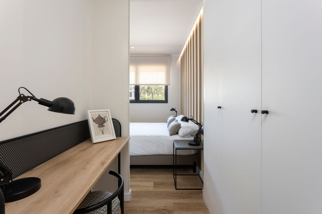 La suite principal incluye tres armarios empotrados, baño en suite con ducha y un escritorio, combinando funcionalidad y confort.
